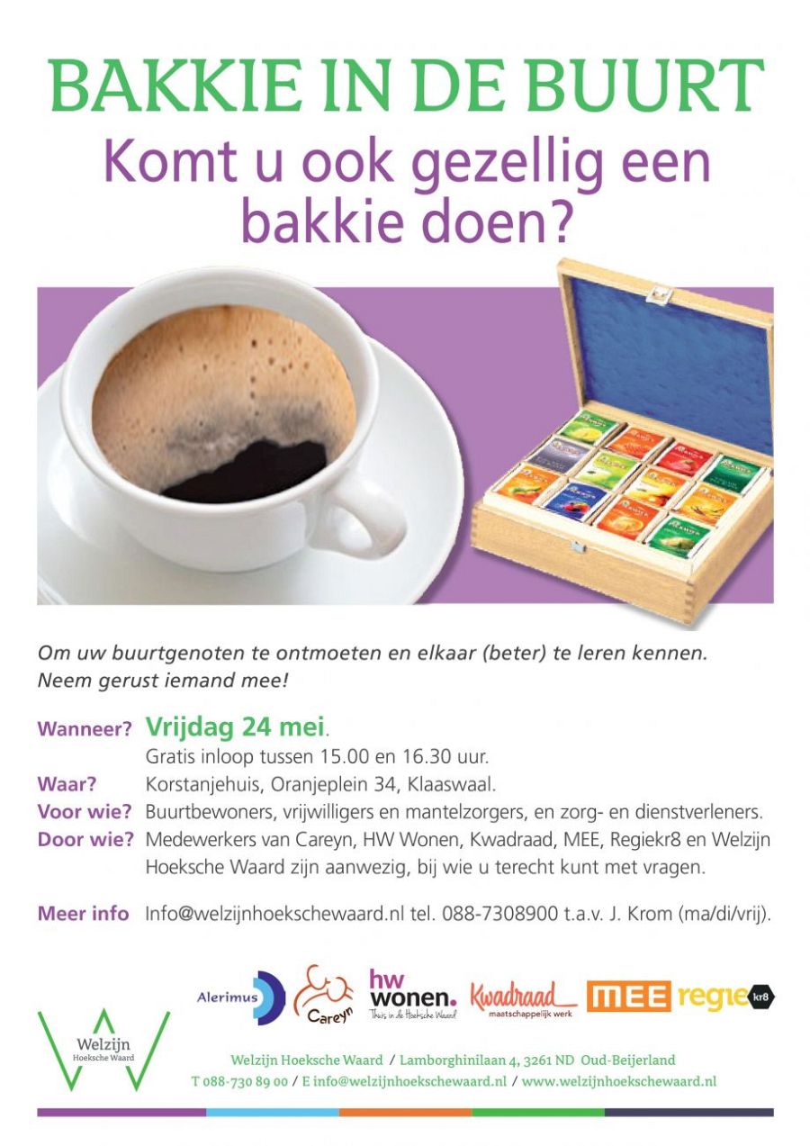 KLAASWAAL - Op vrijdag 24 mei is er een gezellige middag om elkaar uit de buurt beter te leren kennen. Deze nieuwe activiteit draagt de naam Bakkie in de buurt. Iedereen is van harte welkom: buurtbewoners, mantelzorgers, vrijwilligers, maar ook professionals werkzaam in de wijk. Ook zijn er een aantal zorg- en dienstverleners aanwezig bij wie men terecht kan met (hulp)vragen. Uiteraard staat de koffie of thee, met wat lekkers erbij, voor u klaar! Het lekkers wordt mede mogelijk gemaakt door Plus van Biene.