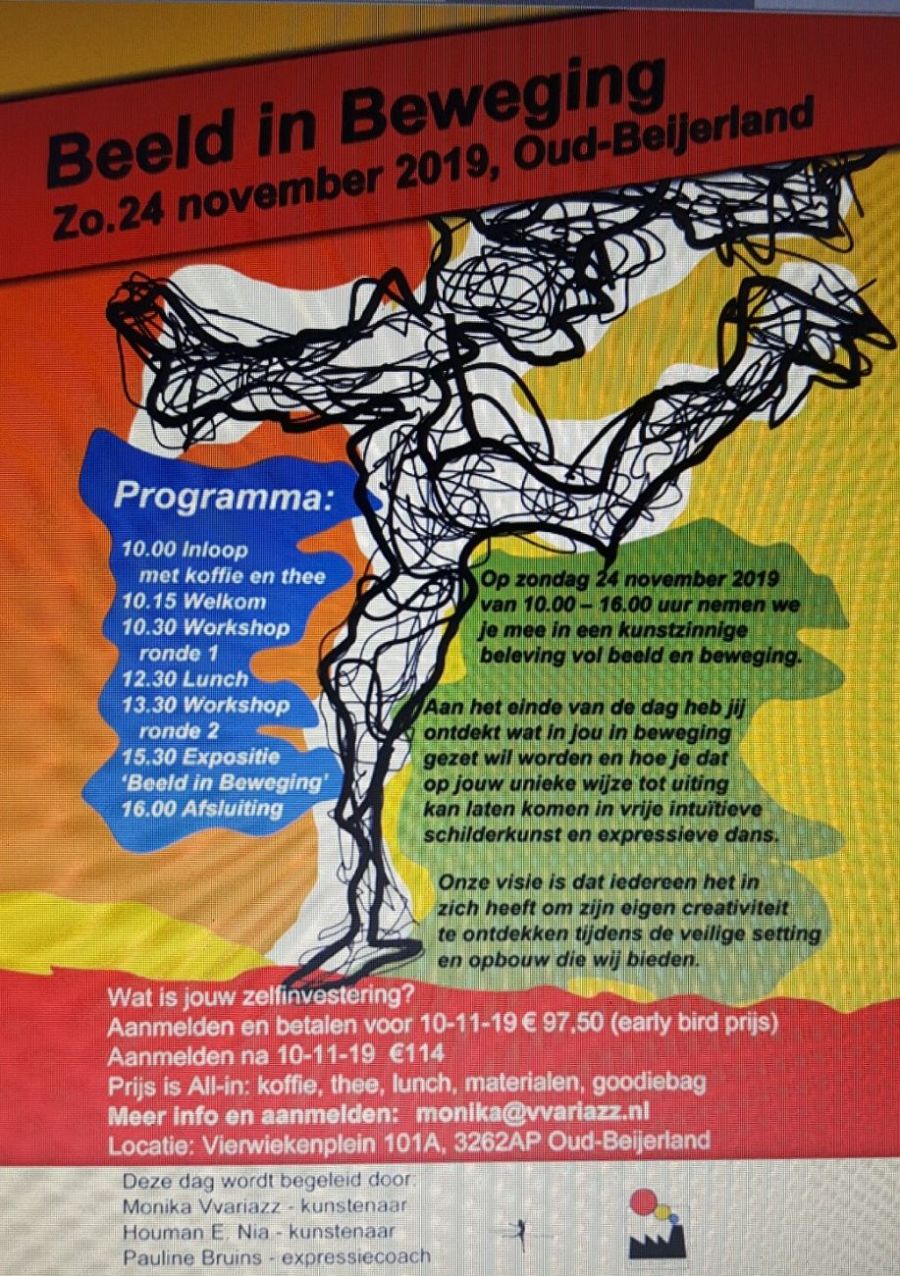 OUD-BEIJERLAND - Laat je meenemen in een kunstzinnige beleving vol beeld en beweging. Aan het einde van de dag heb je ontdekt wat in jou in beweging gezet wil worden en hoe je dat op jouw unieke wijze tot uiting kan laten komen in vrije intuïtieve schilderkunst en expressieve dans.De visie hierbij is, dat iedereen het in zich heeft om zijn eigen creativiteit te ontdekken tijdens een veilige setting en goede opbouw van workshops en een expositie na afloop.