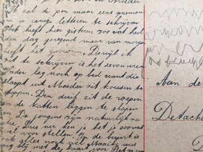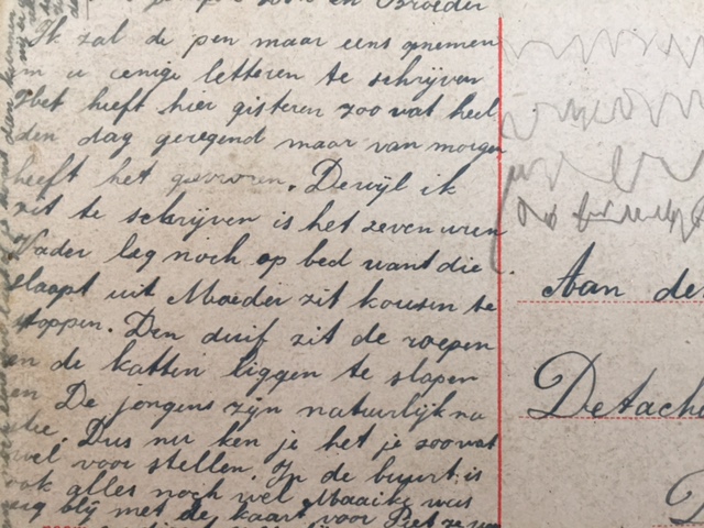 Ik zal de pen maar eens opnemen om u enige letteren te schrijven. Het heeft hier gisteren zoo wat heel den dag geregend maar vanmorgen heeft het gevroren. Dewijl ik zit te schrijven is het zeven uren. Vader leg noch op bed want die slaapt uit. Moeder zit kousen te stoppen. Den duif zit te roepen en de katten liggen te slapen. De jongens zijn natuurlijk al weg. Dus nu ken je het je zoo wat wel voorstellen. In de buurt is alles noch wel. Maaike was erg blij met de kaart voor Piet. Ze kwam er direct mee naar hier. Nu weet ik geen nieuws meer dan in afwachting dat je zaterdag weer te huis bent.