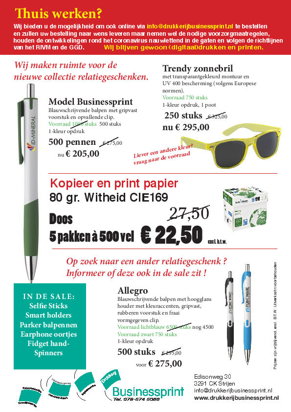 STRIJEN - Thuiswerken? Drukkerij Businessprint biedt u de mogelijkheid om ook online via info@drukkerijbusinessprint.nl te bestellen. Zij zullen uw bestelling naar wens leveren maar nemen wel de nodige voorzorgmaatregelen en houden de ontwikkelingen rond het coronavirus nauwlettend in de gaten en volgen de richtilijnen van het RIVM en de GGD.