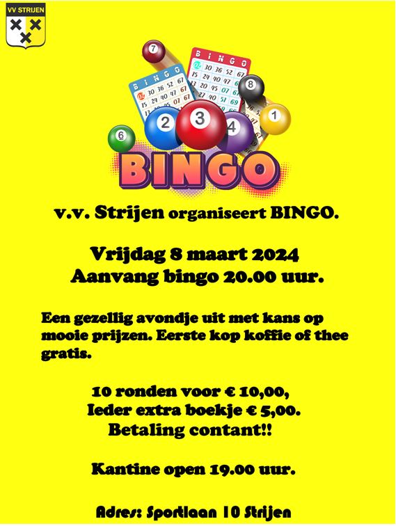 STRIJEN - v.v. Strijen organiseert voor de bingo liefhebbers op vrijdagavond 8 maart weer een bingoavond! De aanvang van de bingo is om 20.00 uur. Een gezellig avondje uit met kans op mooie prijzen- Eerste kop koffie of thee gratis.