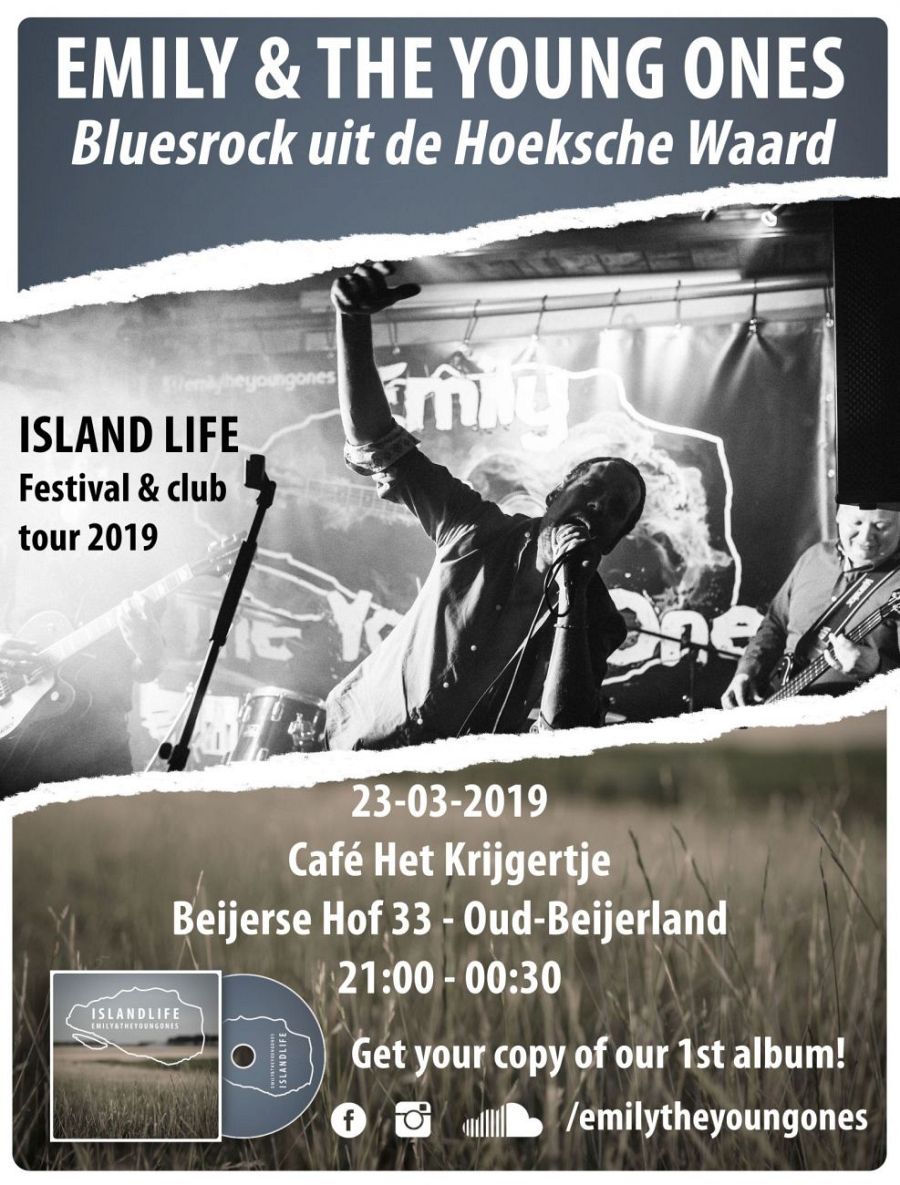 OUD-BEIJERLAND - Bluesrockband ‘Emily & the Young Ones’ treedt zaterdag 23 maart op in Café het Krijgertje aan de Beijerse Hof in Oud Beijerland. Onlangs was de Puttershoekse formatie nog in het nieuws door de opnames van hun clip in de voormalige uitgaansgelegenheid ‘De Posthoorn’ in Puttershoek.Vorige maand was de band ook nog twee keer te gast met live muziek in het radioprogramma 'Cluture Club' bij omroep HW. Naast eigen muziek van hun vorig jaar uitgebrachte CD ‘Island Life’, geïnspireerd op de Hoeksche Waard, speelt de band nieuw eigen werk en herkenbare covers van de jaren 60 tot nu. Entree is gratis, de avond is van circa 21:00 – 00:30