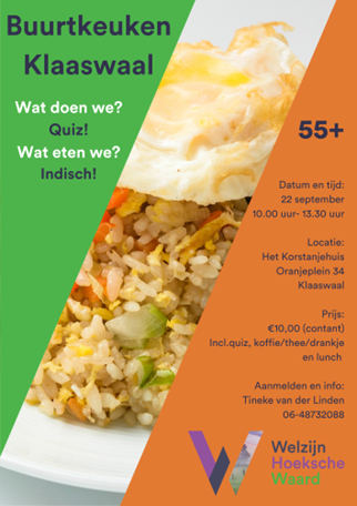 KLAASWAAL - Vrijdag 22 september is er weer een gezellige Buurtkeuken in het Korstanjehuis in Klaaswaal (Oranjeplein 34). Deze activiteit wordt georganiseerd door een groep enthousiaste vrijwilligers van Welzijn Hoeksche Waard en is speciaal bedoeld voor 55+ers. U bent vanaf 10.00 uur van harte welkom en de verwachting is dat het rond 13.15 uur weer afgelopen is.Naast een heerlijke warme lunch met een Indisch tintje zal er vooraf gezorgd worden voor thee of koffie met wat lekkers en zullen we een Hoeksche Waardse quiz doen. Wilt u meegenieten van deze buurtkeuken dan kunt u zich aanmelden bij Tineke van der Linden, 06-48732088. De kosten zijn € 10,- incl. drankjes en quiz. Let op, aanmelden kan tot 18 september.