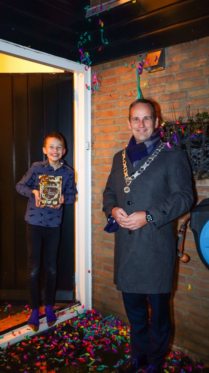 Bram van Hemmen: “Een keuze maken was echt lastig, want alle kandidaten kwamen erg goed over. Chris sprong er bovenuit door zijn enthousiasme, brede interesse en aandacht voor de wereld om hem heen. Ik kijk ernaar uit om met hem samen te werken volgend jaar.” Donderdag 25 november is de burgemeester het nieuws zelf gaan vertellen aan Chris. Met de kinderambtsketting in chocolade werd Chris thuis verrast. Ook kreeg hij een mand met kleine chocolaatjes. Die kon hij de volgende dag goed gebruiken.