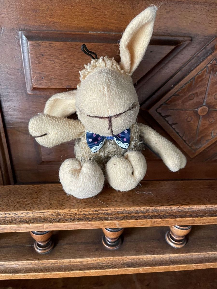 Ik struikel over Lammy, zijn kroel, achtergebleven naast een stoelpoot. Mijn oog valt op het strikje dat Enzo na zijn laatste trimbeurt kreeg van de trimster. Lammy en strik krijgen een ereplekje op de kast.