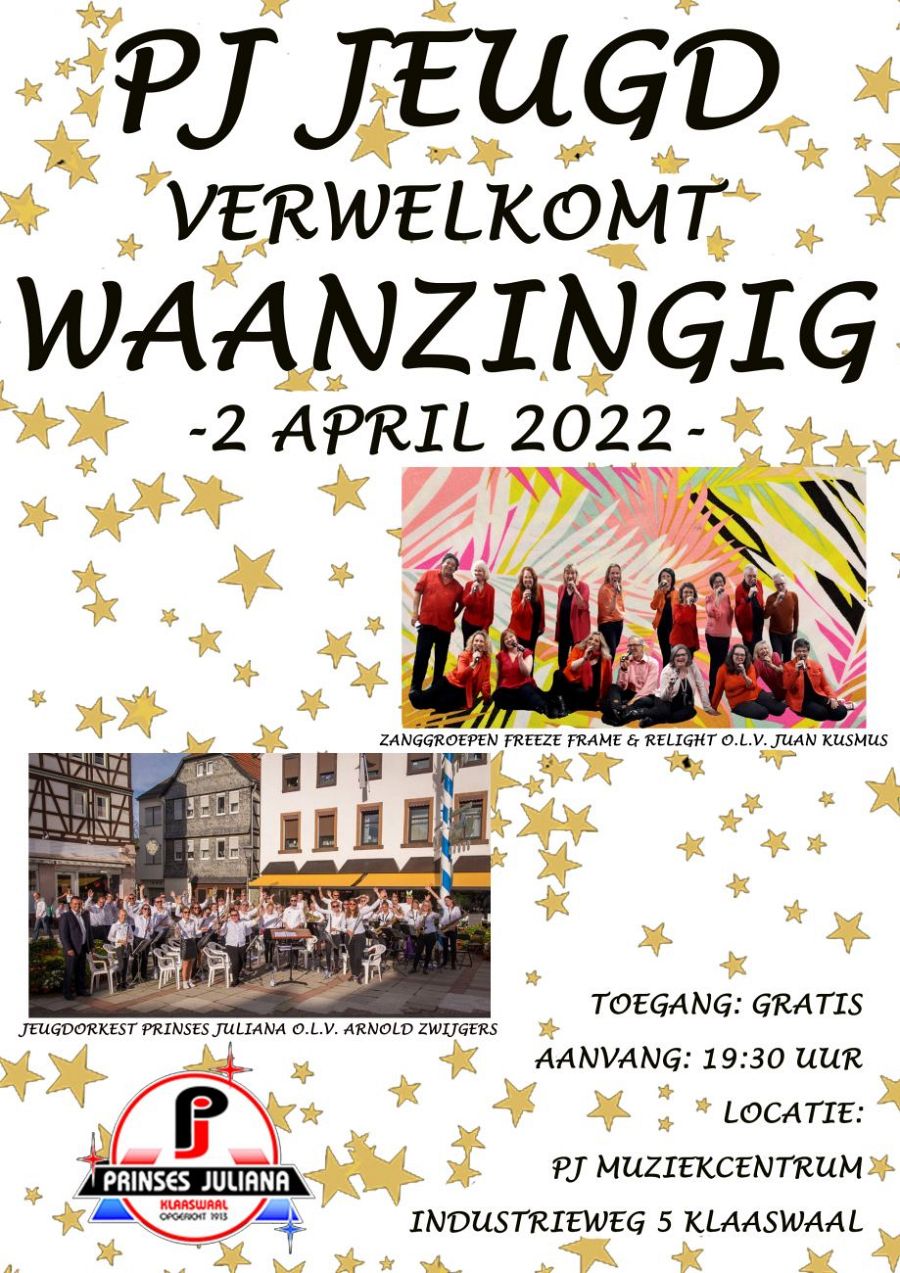 KLAASWAAL - Op zaterdag 2 april zal het jeugdorkest van Prinses Juliana uit Klaaswaal samen met zanggroep WAANZINGIG een mooi concert voor u geven. WAANZINGIG bestaat uit 2 zanggroepen, Freeze Frame & Relight. Hun repertoire zal voornamelijk bestaan uit Nederlands- en Engelstalige Top 2000 nummers. WAANZINGIG komt ook nog samen in actie met het jeugdorkest. Het belooft een mooie avond te worden. Het concert zal plaatsvinden in het PJ Muziekcentrum, industrieweg 5 in Klaaswaal. Aanvang 19:30 uur en de toegang is gratis. Tot dan!