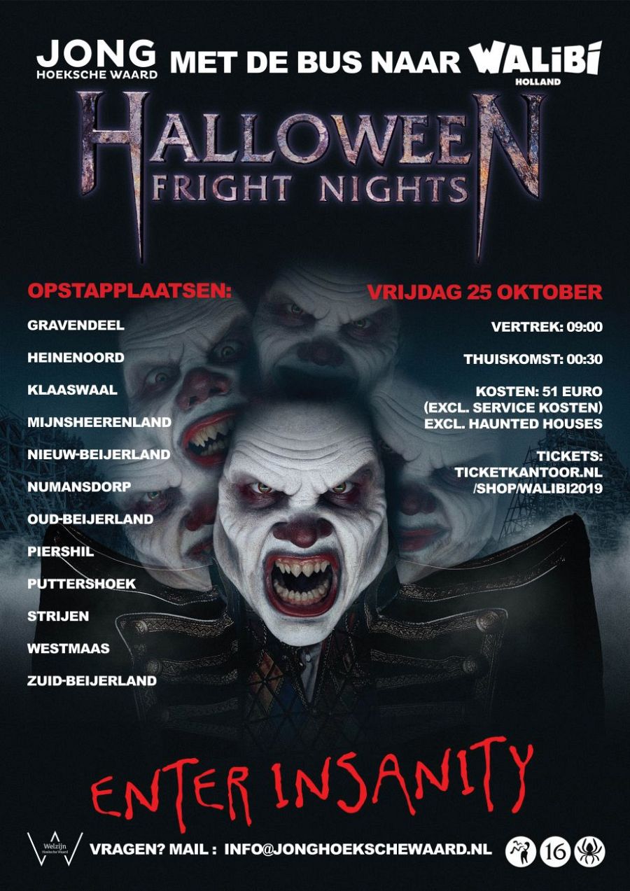 HOEKSCHE WAARD - Vrijdag 25 oktober gaan we met meerdere bussen naar Walibi Fright Nights, dit wordt georganiseerd door Jong Hoeksche Waard. Elk jaar is er veel vraag naar deze activiteit en ook nu hebben jongeren zich al per mail gemeld. Dit jaar zijn er 12 opstapplaatsen om zo de gehele Hoeksche Waard de mogelijkheid te bieden om op te stappen in zijn buurt.
