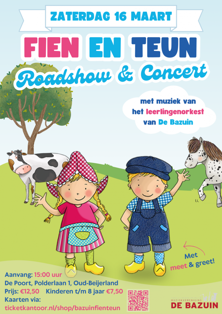 Dit agrarische concert vindt plaats op zaterdagmiddag 16 maart om 15.00 uur in De Poort, Polderlaan 1 in Oud-Beijerland. Kaarten à €12,50 (t/m 8 jaar €7,50) zijn te koop via www.ticketkantoor.nl/shop/bazuinfienteun