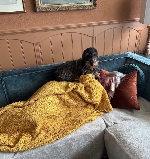Kleinzoon ligt met 40 graden koorts, stevig ingestopt op de bank. Kleidochter vertoeft eveneens op de bank. Haar beste vriendin, teckel Cato is er gezellig bij gekropen. Ik sta onder bewaking van onze Gerrit, die mij met regelmaat aflebbert.