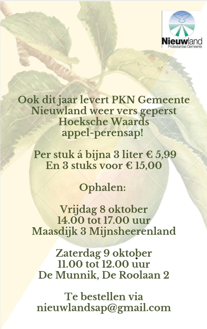 Dus wacht niet te lang en bestel nu deze verrukkelijke vruchtensap. De opbrengst van deze actie is bestemd voor de Protestantse gemeente Nieuwland.