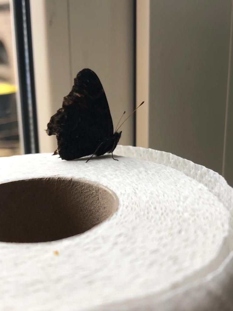 Nadat ze enkele dagen van de aardbol verdwenen leek, dook ons huisgenootje gisteren weer op. Ditmaal landde zij op de keukenrol. Ze was ongewoon actief, klapperde met haar vleugels en wandelde van onder naar boven en weer terug. Het leek alsof de lente in haar bol sloop.Ik zette de keukendeur uitnodigend open. Plaatste de rol naast de deurpost en maande haar te vertrekken. Dit was blijkbaar tegen het zere been, want verontwaardigd sloot ze haar vleugels en bouwde haar muurtje tegen de buitenwereld weer op. Doodstil bleef zij op het zachte papier zitten. Oké, dan niet. Zo zat zij daar urenlang terwijl de wind haar vleugels streelde en zachtjes deed trillen.