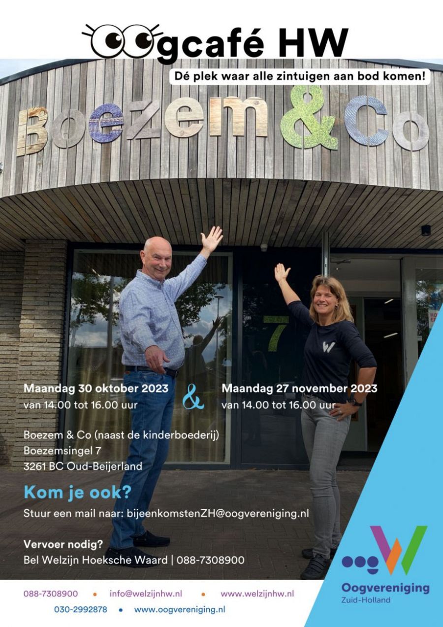 OUD-BEIJERLAND - Elke laatste maandag van de maand in 2023 wordt er een Oogcafé georganiseerd. De eerst volgende bijeenkomst is op maandag 30 oktober aanstaande. Het Oogcafé Hoeksche Waard is dé plek waar alle zintuigen aan bod komen! Het café is in de eerste plaats bedoeld voor alle inwoners van de Hoeksche Waard en omstreken met een oogaandoening of zichtprobleem. Maar uiteraard zijn ook partners, familieleden, vrienden of andere geïnteresseerden van harte welkom. Ontmoet andere inwoners en wissel ervaringen en informatie uit onder het genot van een kop koffie of thee. De inloop is vanaf 14.00 uur bij Boezem & Co te Oud-Beijerland aan de Boezemsingel 7. Dat is naast de kinderboerderij, parkeren is daar ook mogelijk. Met openbaar vervoer kunt u de buurtbus nr. 712 nemen, deze stopt direct voor de deur. Verdere vervoersalternatieven naast de regulier vervoer kunnen ANWB automaatje (buiten de dorpskernen) of de Wielewaal (binnen Oud-Beijerland) zijn. Toegang is geheel gratis, een vrijwillige bijdrage voor de koffie of thee mag.