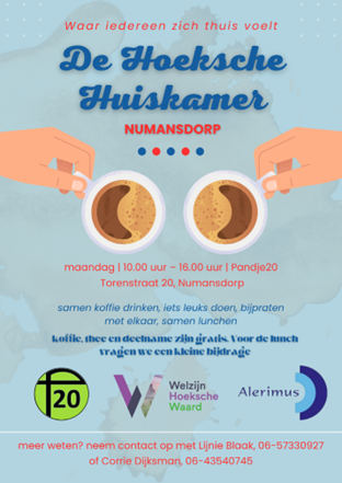 NUMANSDORP - Wist u dat de Hoeksche Huiskamer in Numansdorp de hele zomer open is op maandagen van 10.00 uur tot 16.00 uur? Op maandag 5 augustus bestaan we zelfs alweer 5 jaar! Samen koffie drinken, iets leuks doen, bijpraten met elkaar, samen lunchen. Dat is een greep uit wat er gebeurt op een dag in de Hoeksche Huiskamer die u kunt vinden in Pandje20 aan de Torenstee 20 in Numansdorp.Koffie en thee zijn gratis. Wilt u mee lunchen? Dan vragen we een bijdrage van €2,50. Alleen de ochtend of middag komen of alleen mee lunchen? Allemaal mogelijk! Aanmelden is niet nodig. Meer weten? neem contact op met Lijnie Blaak, 06-57330927 of Corrie Dijksman, 06-43540745
