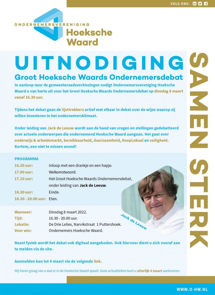 ZUID-BEIJERLAND - Op woensdag 19 april organiseert Ondernemersvereniging Hoeksche Waard (OHW) het Hoeksche Waards Ondernemersdebat. Onder leiding van Miranda den Tuinder gaan ondernemers politiek in debat. Het themaL Waar staan we een jaar na de verkiezingen?Wat speelt er in de Hoeksche Waard en wat hebben we intussen bereikt? Aan de hand van actuele thema's zoals duurzaamheid, bereikbaarheid, arbeidsmarkt en onderwijs wordt hierover gediscusseerd.