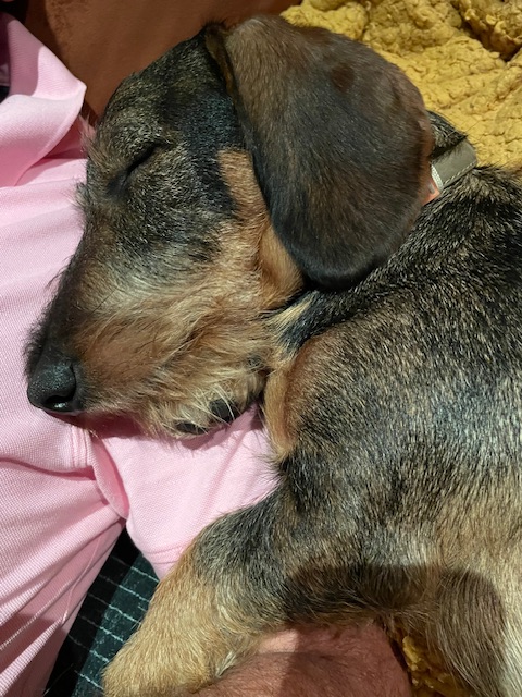 Terwijl manlief als een blok in slaap valt, probeer ik nieuweling naar zijn mand te dirigeren. Eindelijk rolt hij op de rug en sluit zijn ogen. Nu ik nog.
