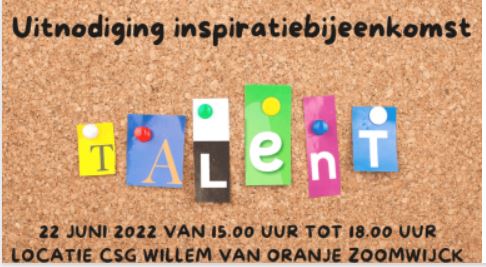 Op woensdag 22 juni vindt de Inspiratiebijeenkomst Talent plaats. De bijeenkomst is bedoeld voor professionals en vrijwilligers die met kinderen werken en bij kunnen dragen aan hun talentontwikkeling. Er worden hierover verschillende workshops en lezingen gegeven met als doel de kennis over talent te vergroten en te inspireren.Het is belangrijk dat kinderen hun talenten kennen