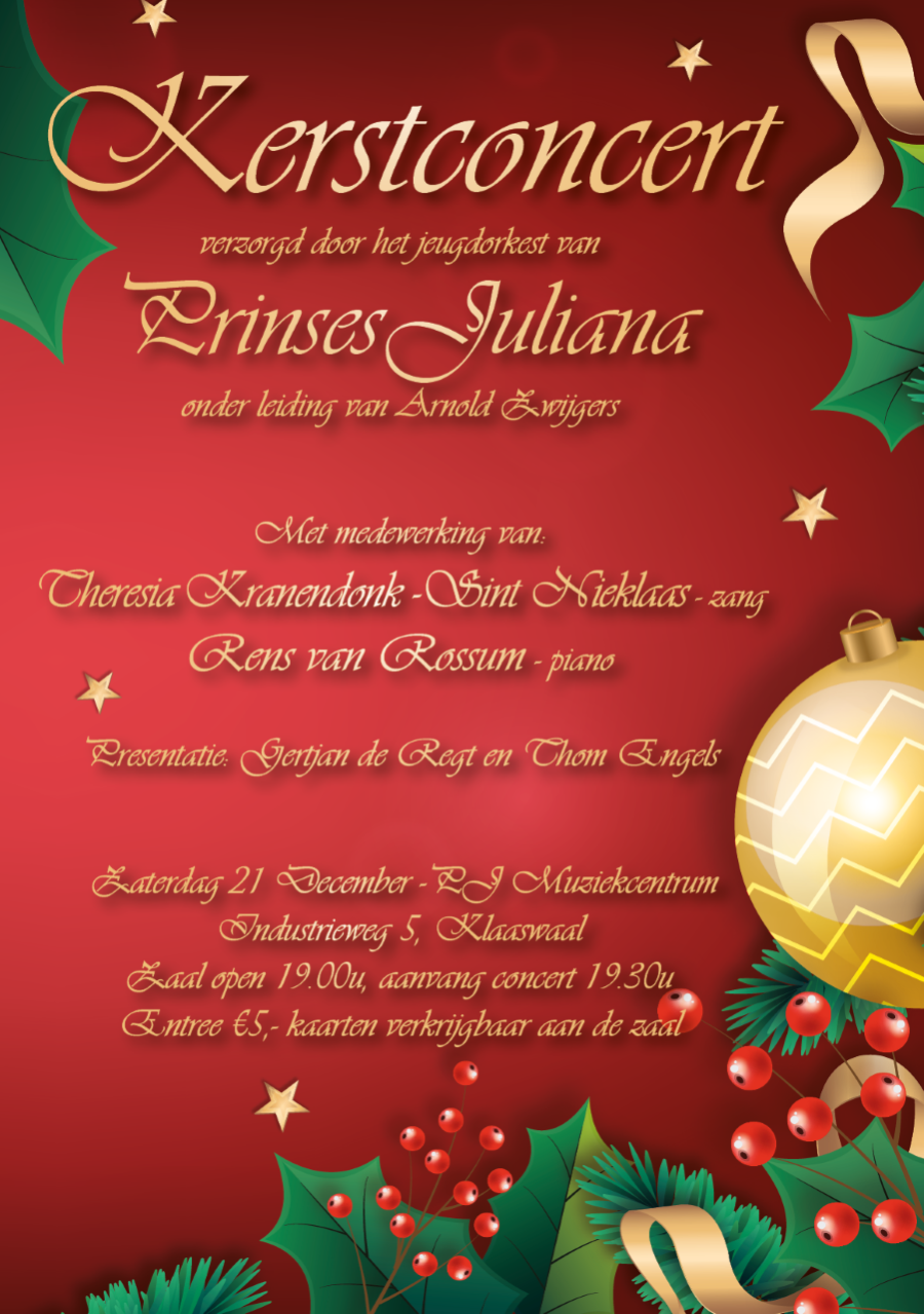 KLAASWAAL - Op zaterdag 21 december zal het jeugdorkest een sfeervol kerstconcert geven in samenwerking met zangeres Theresia Kranendonk - Sint Nieklaas en pianist Rens van Rossum. Het concert vindt plaats in het PJ muziekcentrum aan de Industrieweg 5 te Klaaswaal. De zaal gaat om 19.00 uur open en het concert begint om 19.30 uur. Entree €5,-kaarten zijn aan de zaal verkrijgbaar. Het belooft een gezellige avond te worden. Tot dan!