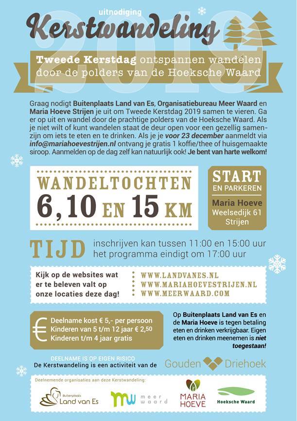 STRIJEN - Kerstwandeling door de polder(s) van Strijen, georganiseerd door Maria Hoeve Strijen, Organisatiebureau Meer Waard en Buitenplaats Land van Es op donderdag 26 december a.s. tussen 11.00 en 17.00 uur.Deelnemers aan deze traditionele kerstwandeling hebben dit jaar de keuze tussen een wandeling van 6, 10 én 15 kilometer. De wandelingen inspireren deelnemers om vooral samen om zich heen te kijken en te genieten van de natuur. De wandelingen komen langs twee locaties van de Gouden Driehoek nl. Buitenplaats Land van Es en de Maria Hoeve. Op zowel de Maria Hoeve Strijen als Buitenplaats Land van Es kunt u tegen betaling heerlijk eten en drinken verkrijgen.
