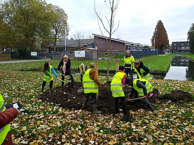 Enthousiast stroopten de kinderen uit de groepen 6 hun mouwen op om de bomen te planten.