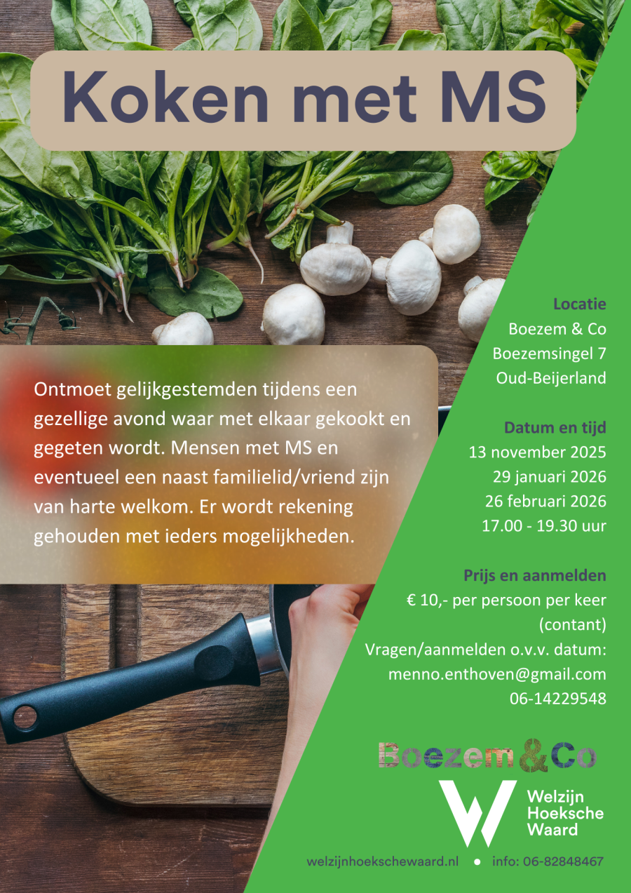 OUD-BEIJERLAND - Ontmoet anderen die leven met multiple sclerose (MS) tijdens een gezellige en smakelijke avond bij Boezem & Co in Oud-Beijerland. Onder het motto “Koken met MS” gaan deelnemers samen aan de slag in de keuken om daarna van hun eigen gerechten te genieten.Tijdens deze avonden draait het niet alleen om koken, maar vooral om ontmoeting, ontspanning en plezier. Mensen met MS en eventueel een naast familielid of vriend zijn van harte welkom. Er wordt rekening gehouden met ieders mogelijkheden, zodat iedereen op zijn of haar eigen manier kan meedoen.