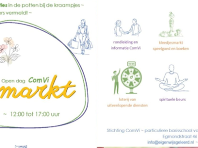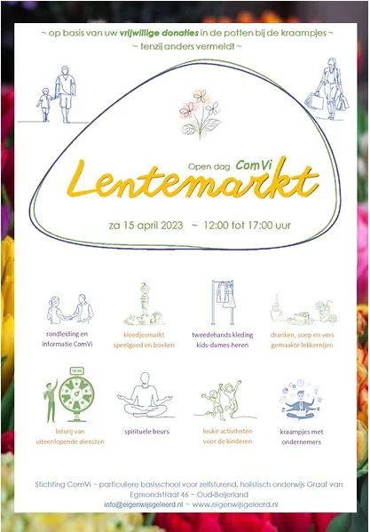 OUD-BEIJERLAND - Zaterdagmiddag 15 april van 13.00 tot 17.00 uur organiseert particuliere B3 school, ComVi, eengezellige open dag en lentemarkt. Door onze hele school, als wel op beide schoolpleinen vind je allerlei leuks te doen, te spelen, te zien, te knutselen, te kopen, te kletsen en vers gemaakt eten & drinken. Alles op basis van uw zelfgekozen donaties.