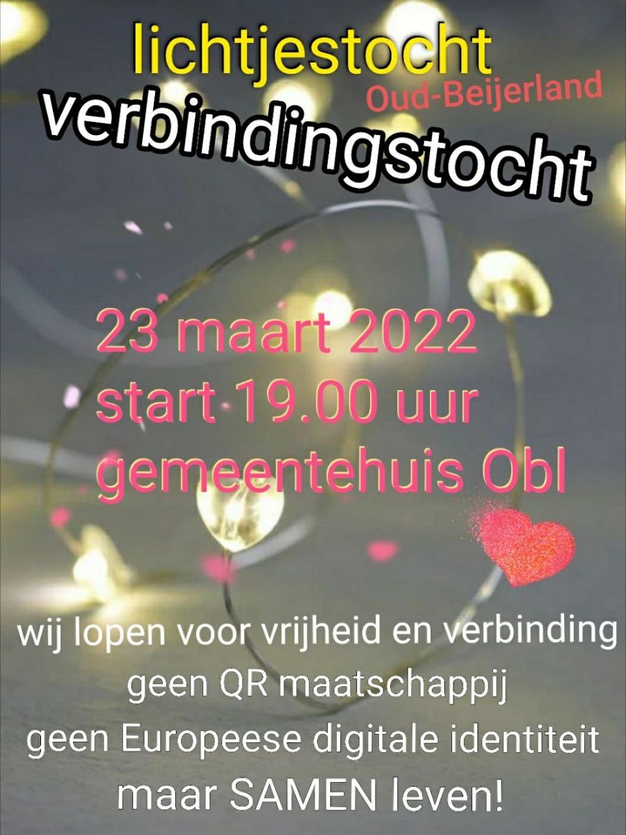 Op 23 maart, dus a.s. woensdag organiseren we weer een lichtjestocht, door Oud-Beijerland heen. We lopen voor de vrijheid, voor kwetsbaarheid, voor kinderen, ouderen en voor elkaar. Maar het meest lopen we nog voor een open en vrije samenleving. Ons lichaam is van ons en daar blijft de overheid en gemeente vanaf. We hebben goed contact met de politie, met verschillende Buitengewone opsporings-ambtenaren en met lokale pers. Wat begon als een klein protest in 10 steden is inmiddels uitgegroeid tot wekelijkse protesten in meer dan 100 dorpen en steden, en de aantallen blijven groeien!