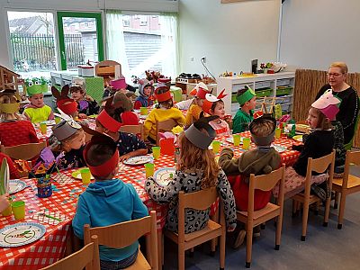 Na een gezellige afscheidsochtend in de groep, waarbij ook nog een heerlijke kikkertaart werd gegeten was het tijd voor de afscheidsreceptie in het speellokaal. Het was een gezellige ochtend waar juf Thea erg van heeft genoten!