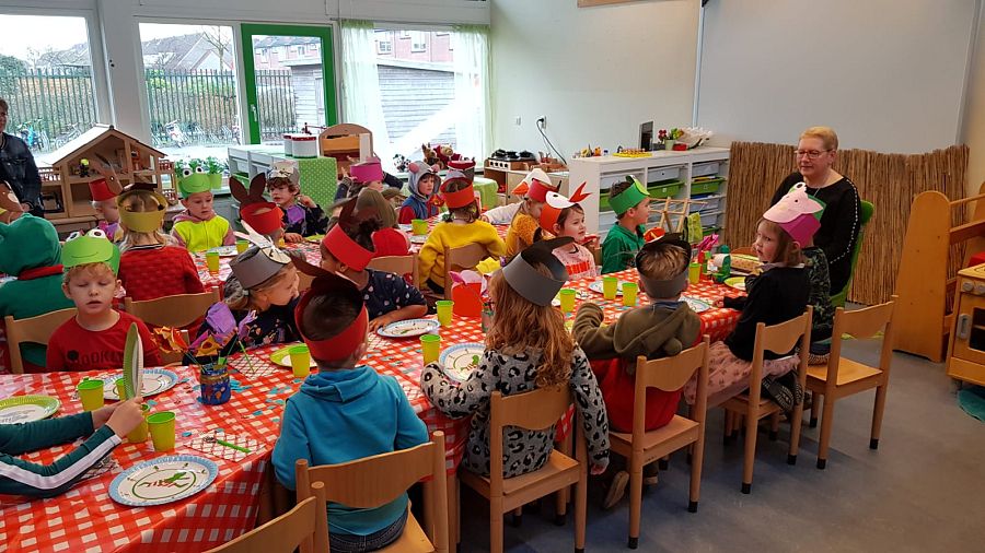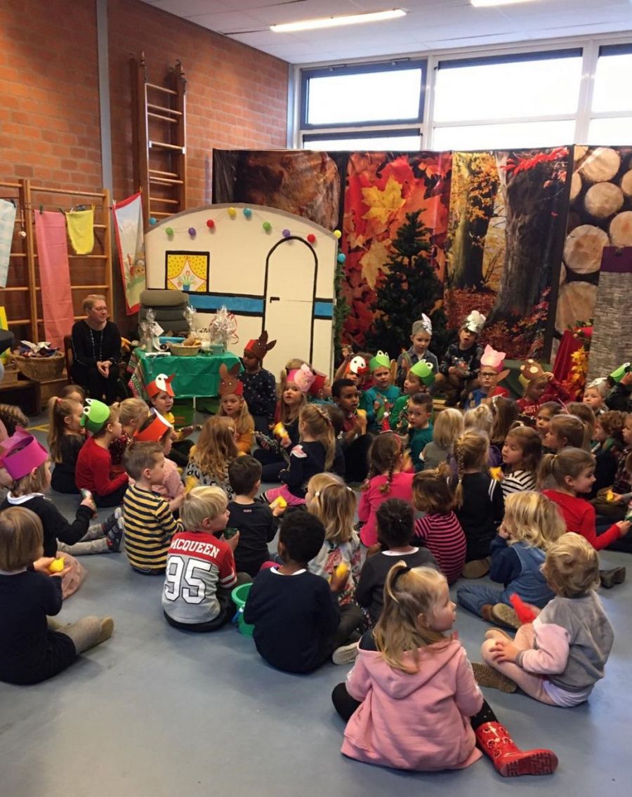 Juf Thea was enorm trots op alle kinderen! Na het toneelstuk kreeg de juf een uitnodiging om in de ‘kikkerklas’ te komen. Daar was een echt klein deurtje waar ze samen met de kinderen doorheen moest. Daar stond haar versierde stoel klaar.