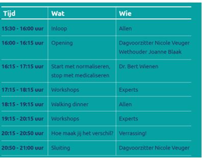 Key note speaker dr. Bert Wienen, bevlogen onderzoeker, adviseur en spreker streeft naar een bredere definitie van normaal. Hij is ervan overtuigd dat, als we het medicaliseren een halt toeroepen, meer kinderen kunnen opgroeien met het idee dat ze normaal zijn - ook als ze afwijken van ‘de norm’.