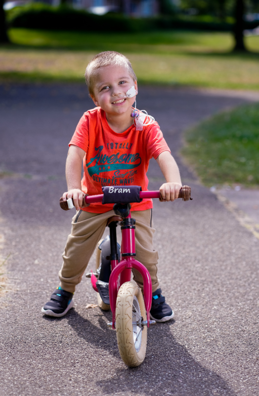Bram (4) is geboren met een erfelijke nierziekte en is elke dag afhankelijk van de dialyse. Eigenlijk heeft hij zo snel mogelijk een niertransplantatie nodig. Zijn moeder Marianne: “Als ik denk aan wat hij in zijn jonge leven allemaal al heeft meegemaakt word ik heel verdrietig. Maar we moeten door en daarom is het ook belangrijk om optimistisch te blijven. Ik denk dat het vooral Bram zelf is, die me op de been houdt. Want hij blijft vrolijk en vol levenslust. Ondanks dat hij dagelijks moet dialyseren, snel moe is, al die medicatie moet slikken en zich aan een strikt zout- en fosfaatarm dieet moet houden. Voor mij is hij de grootste jonge held die er is.”