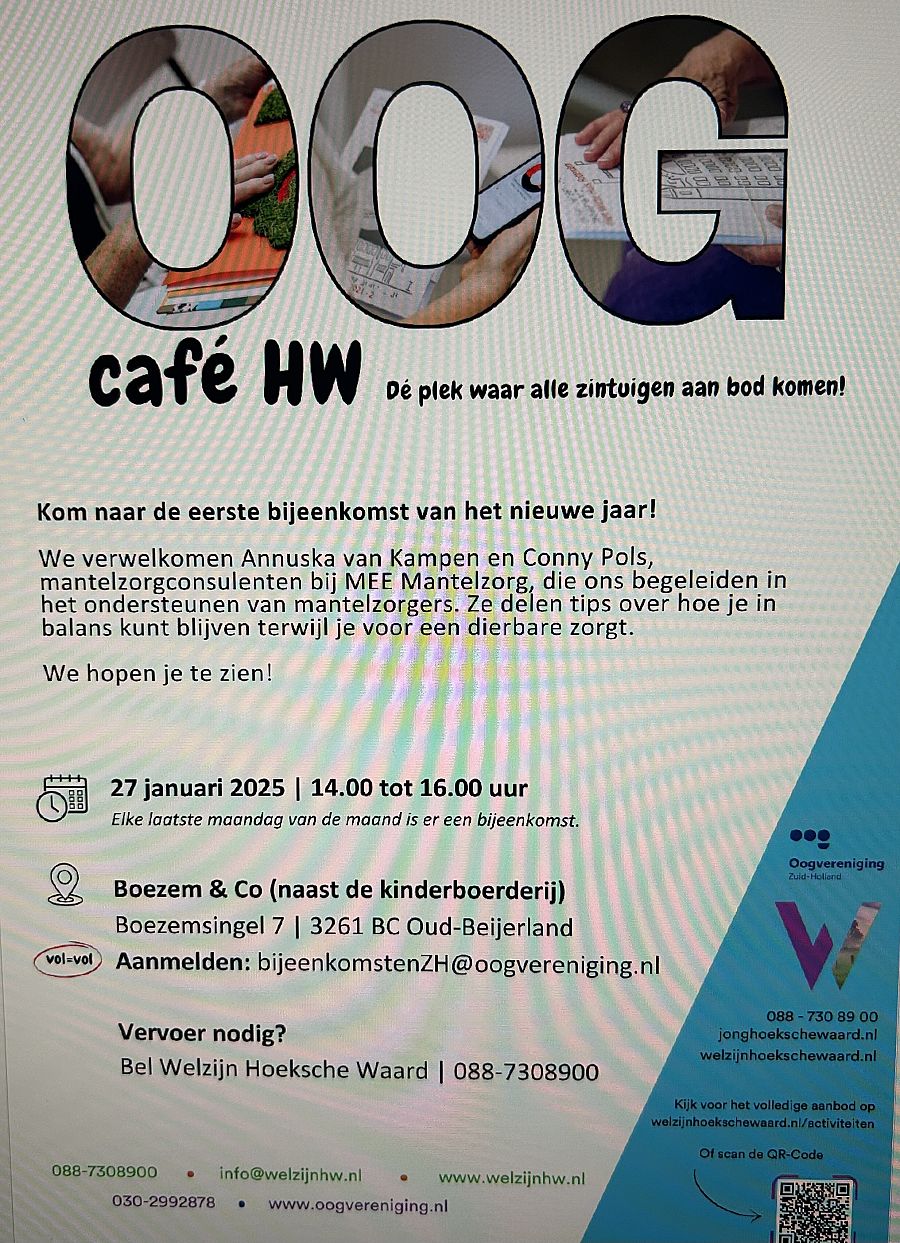OUD-BEIJERLAND - Op 27 januari 2025 opent het Oogcafé Hoeksche Waard haar deuren voor de eerste bijeenkomst van het nieuwe jaar. Te gast zijn Annuska van Kampen en Conny Pols; zij werken als mantelzorgconsulenten bij MEE Mantelzorg. Ze ondersteunen mantelzorgers in de gemeente Hoeksche Waard om het zorgen voor hun naaste vol te houden en daarbij ook zelf in balans te blijven. Tijdens het Oogcafé HW vertellen ze wat mantelzorg is en gaan we met elkaar in gesprek over hoe je in balans kunt blijven.