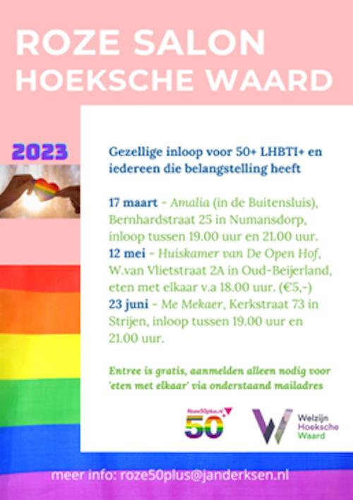NUMANSDORP - Vrijdag 17 maart vindt de Roze Salon weer plaats. Tijdens dit leuke initiatief van Roze 50+ en Welzijn Hoeksche Waard zijn we deze keer welkom in Amalia (Alerimus, De Buitensluis) 50+ LHBTI-ers, buren, vrienden en familie en iedereen die geïnteresseerd is van harte welkom tussen 19.00 uur en 21.00 uur om gezellig een drankje te komen doen op deze vrijdagavond-borrel. Tijdens de bijeenkomsten van de Roze Salon ontstaan er allerlei leuke gesprekken. Komt u deze keer ook? We maken er een gezellige avond van met een hapje en een drankje. Amalia, Bernhardstraat 25, Numansdorp.