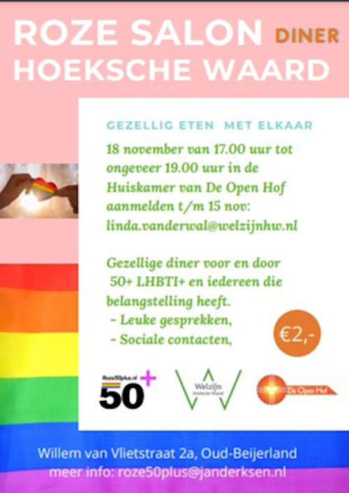 OUD-BEIJERLAND - 18 november is het weer zover! Er is weer Roze Salon in de Open Hof. Dit keer geen vrijdagmiddagborrel, maar een gezellig diner tussen 17.00 uur en +/- 19.00 uur.Tijdens dit leuke initiatief van Roze 50+, Welzijn Hoeksche Waard en de Open Hof zijn 50+ LHBTI-ers, hun buren, vrienden of familie en iedereen die geïnteresseerd is van harte welkom in de huiskamer van de Open Hof aan de W. van Vlietstraat 2a in Oud-Beijerland.
