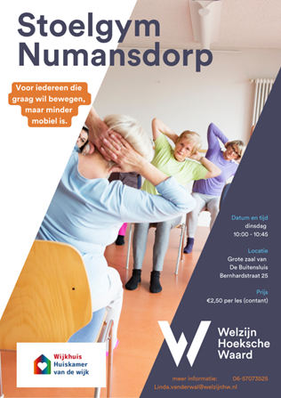 NUMANSDORP - Vanaf dinsdag 19 september bent u van harte welkom bij de lessen Stoelgym in Numansdorp. De Lessen worden gegeven door de beweegcoach van Welzijn Hoeksche Waard en in de maand september zijn de lessen gratis ter kennismaking (v.a. oktober €2,50 per les). Bent u minder mobiel, maar zou u toch graag willen bewegen? Meldt u dan nu aan bij Linda van der Wal, linda.vanderwal@welzijnhw.nl 06-82848467. De lessen zullen plaatsvinden in de grote zaal van Alerimus de Buitensluis, Bernhardstraat 25, op dinsdagen van 10.00 uur tot 10.45 uur. Aansluiten kan er gezellig samen koffie gedronken worden. Stoelgym Numansdorp is een samenwerking tussen Welzijn Hoeksche Waard en Huiskamer van de Wijk ‘Wijkhuis’.