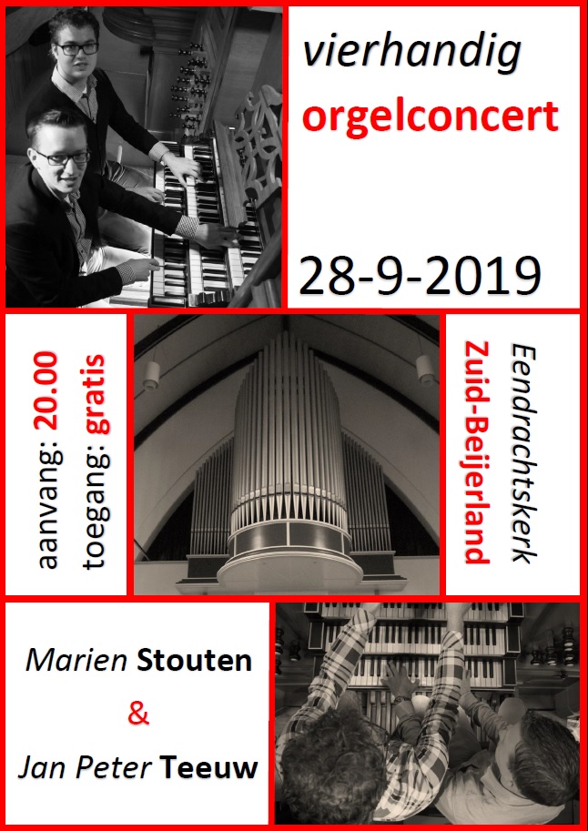 ZUID-BEIJERLAND - Op zaterdag 29 september 2018 geven de organisten Marien Stouten en Jan Peter Teeuw een vierhandig orgelconcert in de Eendrachtskerk te Zuid-Beijerland. Voor het veertiende achtereenvolgende jaar concerteren beide organisten op het grootste orgel van de Hoeksche Waard, dat na de restauratie vorig jaar weer beter klinkt dan ooit!Het programma is ook dit jaar weer verrassend veelzijdig: er klinkt onder andere muziek van Mendelssoh, Mozart, Gardonyi en Saint-Saëns. Daarnaast spelen beide organisten twee solo’s.