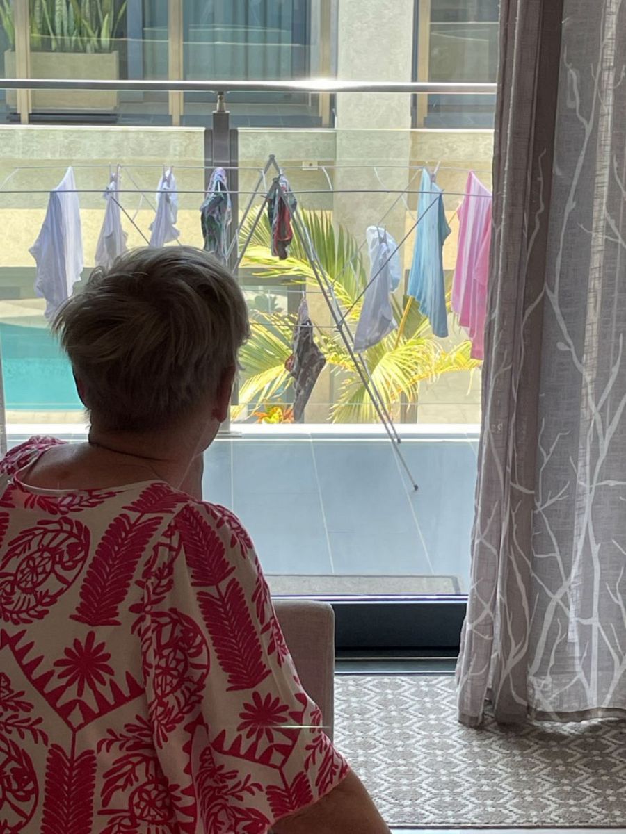 Een windvlaag! Ogenblikje, een vliegend hemd. Bijna over de reling. Net op tijd erbij. Als ze in het zwembad belanden, kunnen we weer overnieuw beginnen. Mijn praktisch ingestelde man adviseert de hemden met de bandjes vast te knopen aan het rek. Goed idee, maar dan duurt het wel langer voordat ze droog zijn. Wat is wijsheid?