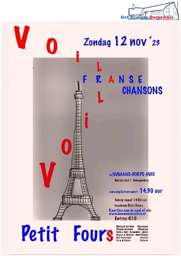 NUMANSDORP - Onder deze titel zingt en speelt Petit Four op 12 november heerlijke Franstalige muziek in vele verschillende genres. Van Stromae tot Aznavour, van Frande Gall tot de Poppy’s. De groep bestaat uit een gitarist, drummer, zangeres en bassist. De muziekmiddag begint om 14.30 uur in Het Numans-Dorps-huis, Buttervliet 1. Kaartjes 10,- via de webshop van numansdorpshuis.nl