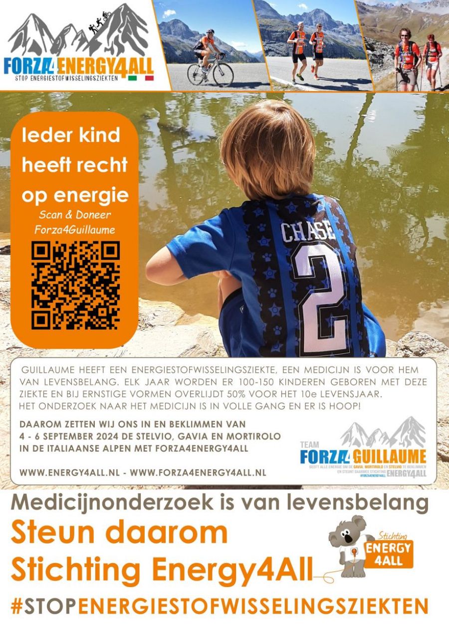 Wil jij ook bijdragen en het medicijnonderzoek steunen? En Guillaume en zijn lotgenootjes uitzicht geven op een toekomst met meer energie? Ga dan naar https://actie.energy4all.nl/teams/forza4guillaume of scan de QR-code.